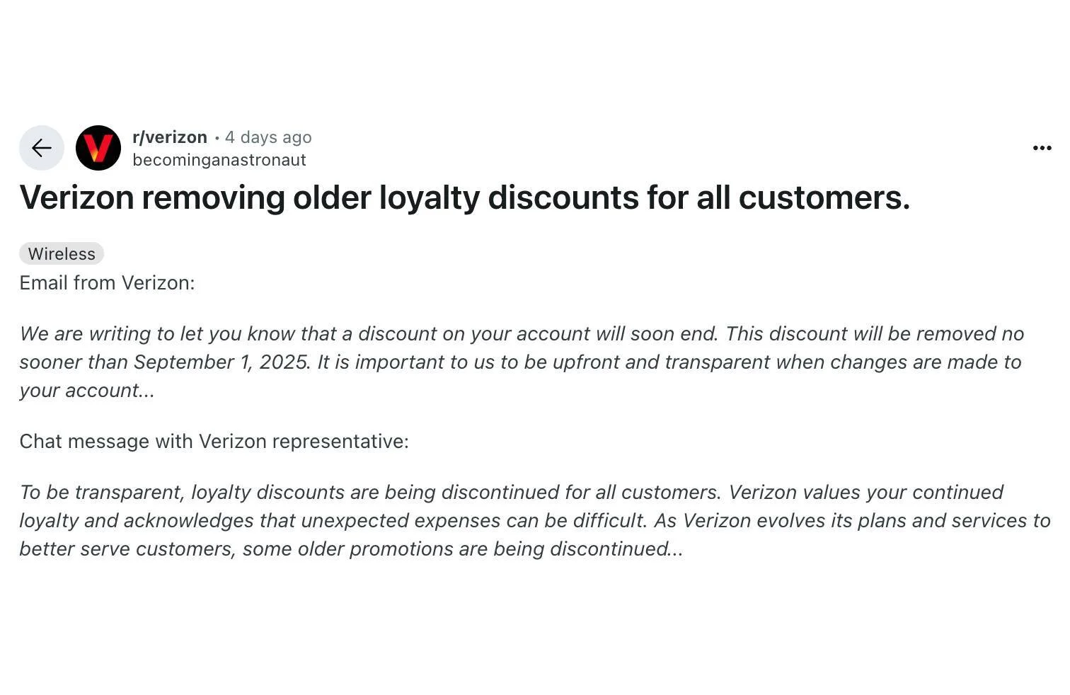 Previously, Verizon had planned to eliminate loyalty discounts for all customers.
