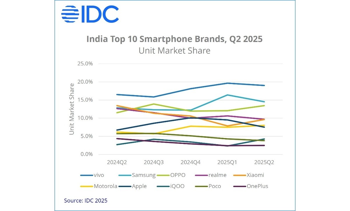 During the first half of this year, the Indian smartphone market experienced a 1% growth compared to the first half of 2024. According to IDC, 70 million units were sold in total, with 37 million smartphones shipped in the second quarter (April to June) alone, representing a 7.3% year-on-year increase.