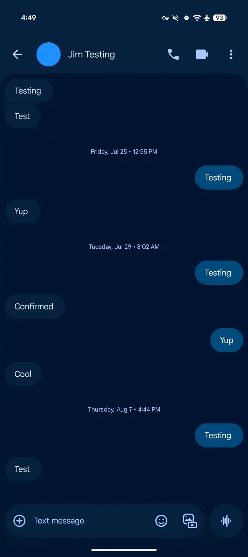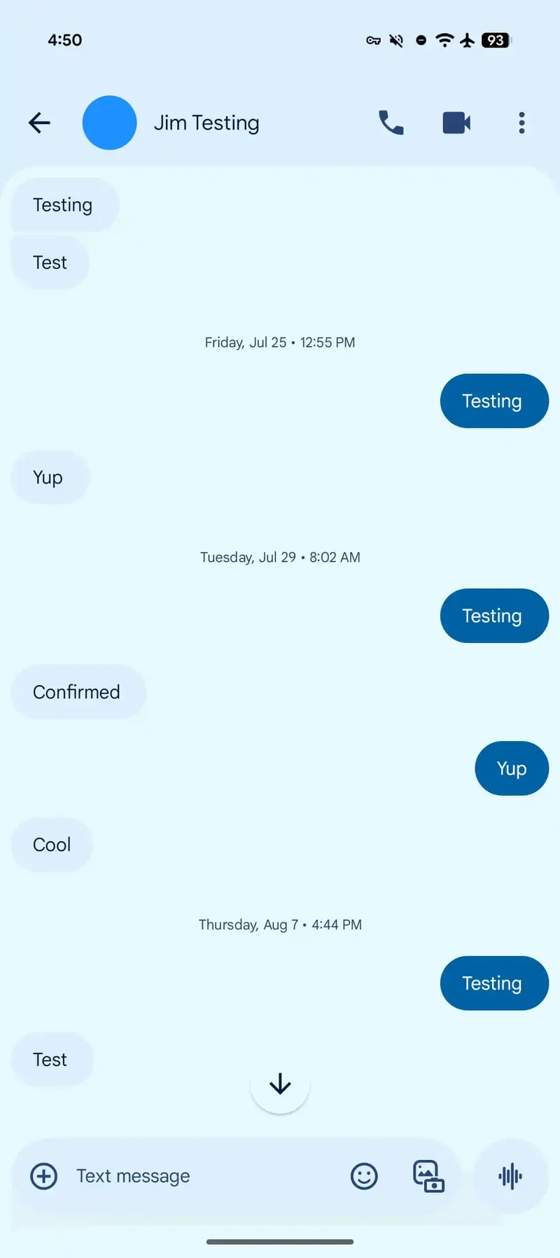 Furthermore, individual message threads are now enclosed in rounded-corner containers that align with the updated home screen design. The app bar at the top remains functional, offering quick access to call and overflow options.