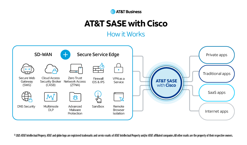 AT&T SASE with Cisco aims to simplify the complexities of networking and security by offering a unified, cloud-native platform. With multilayer security, smart routing powered by SD-WAN, full visibility and reporting capabilities, automated security workflows, and multi-cloud connectivity, this solution streamlines IT management and ensures end-to-end protection for users, devices, and data.