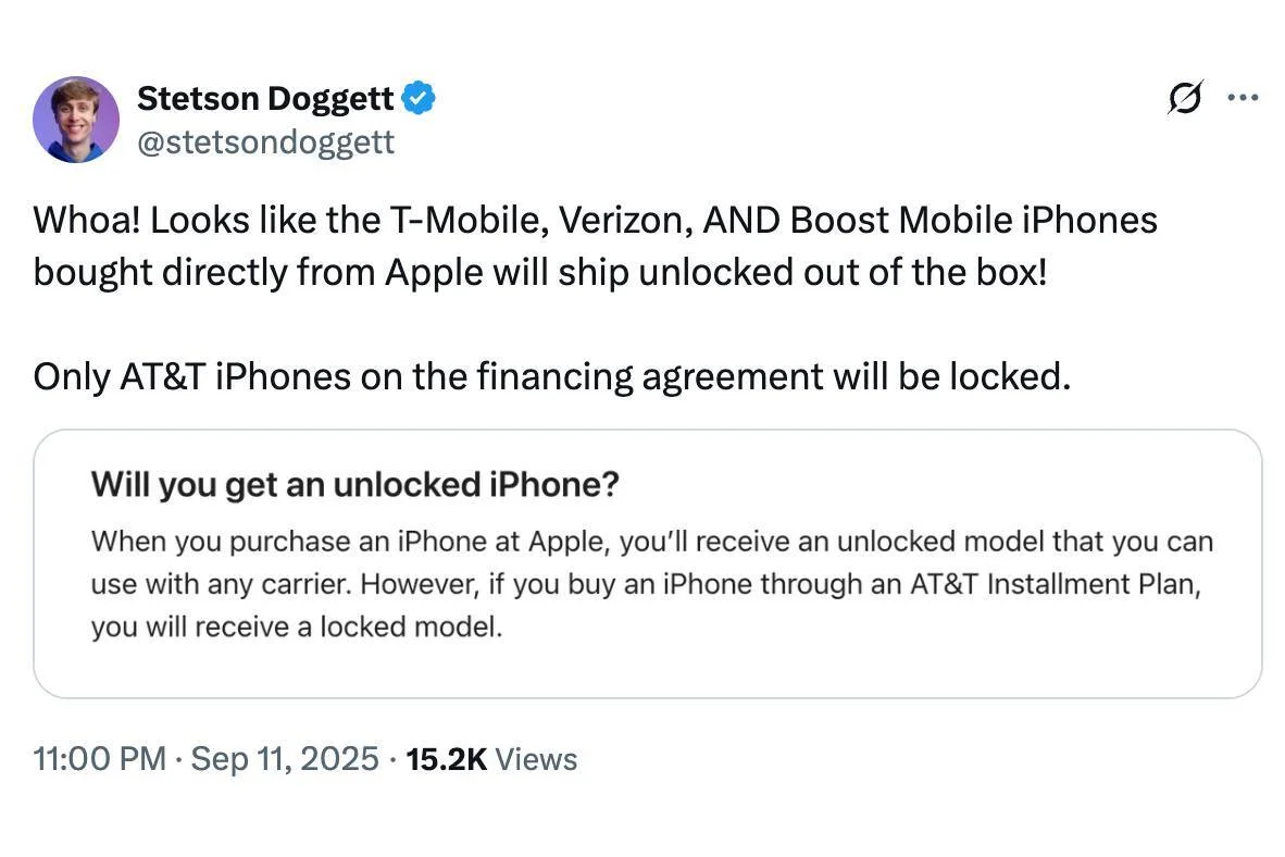 If you are a T-Mobile, Verizon, or Boost Mobile customer, purchasing an unlocked iPhone 17 directly from Apple can save you from being locked to a specific network until the device is fully paid off. This offers more flexibility and options for the consumer, in line with FCC's recommendations for customer choice.