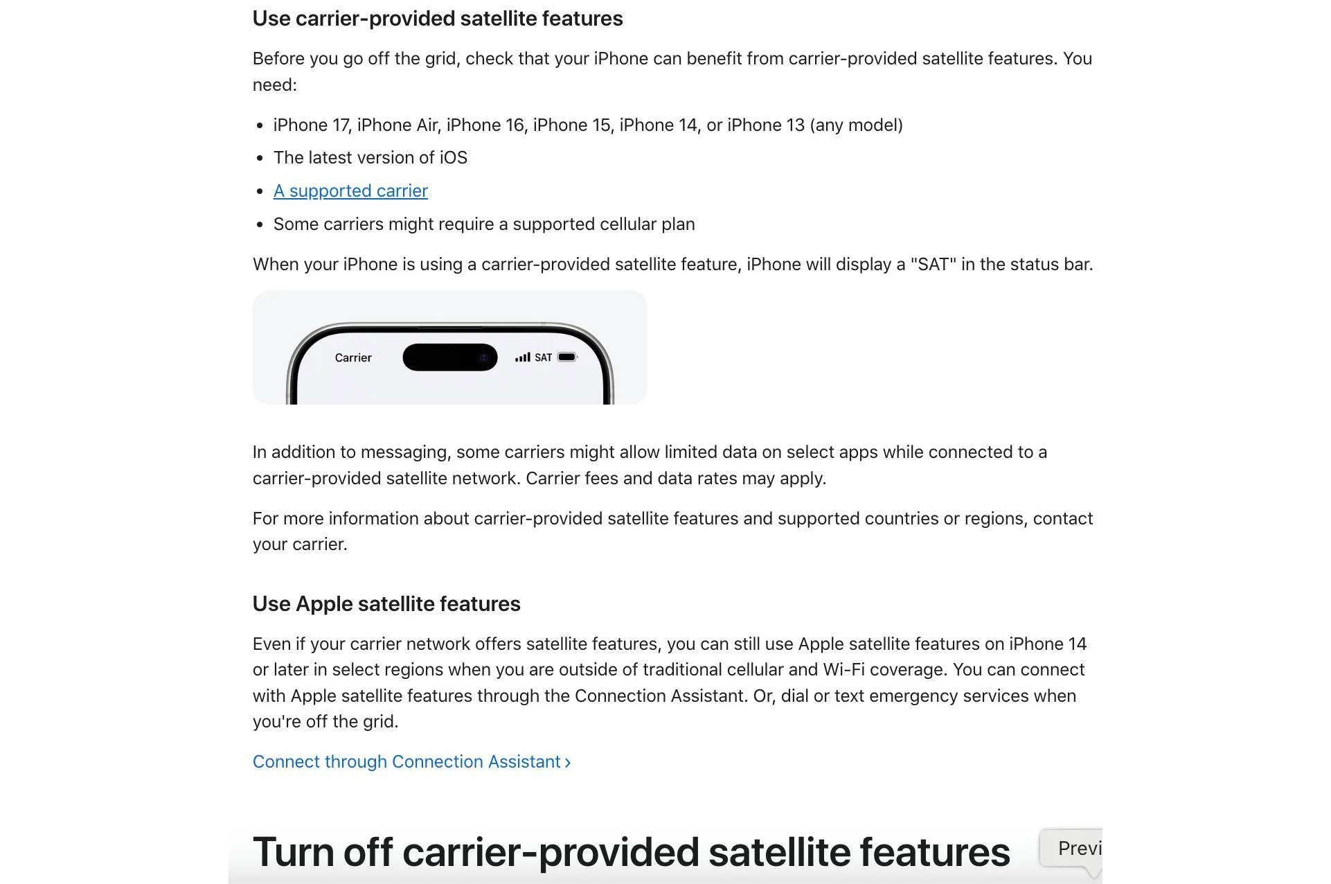 reminds users that even if their service provider offers satellite features, they can still use the iPhone's built-in satellite features instead. Its website has been updated to inform users that carrier-provided satellite features can be turned off in the Settings app.