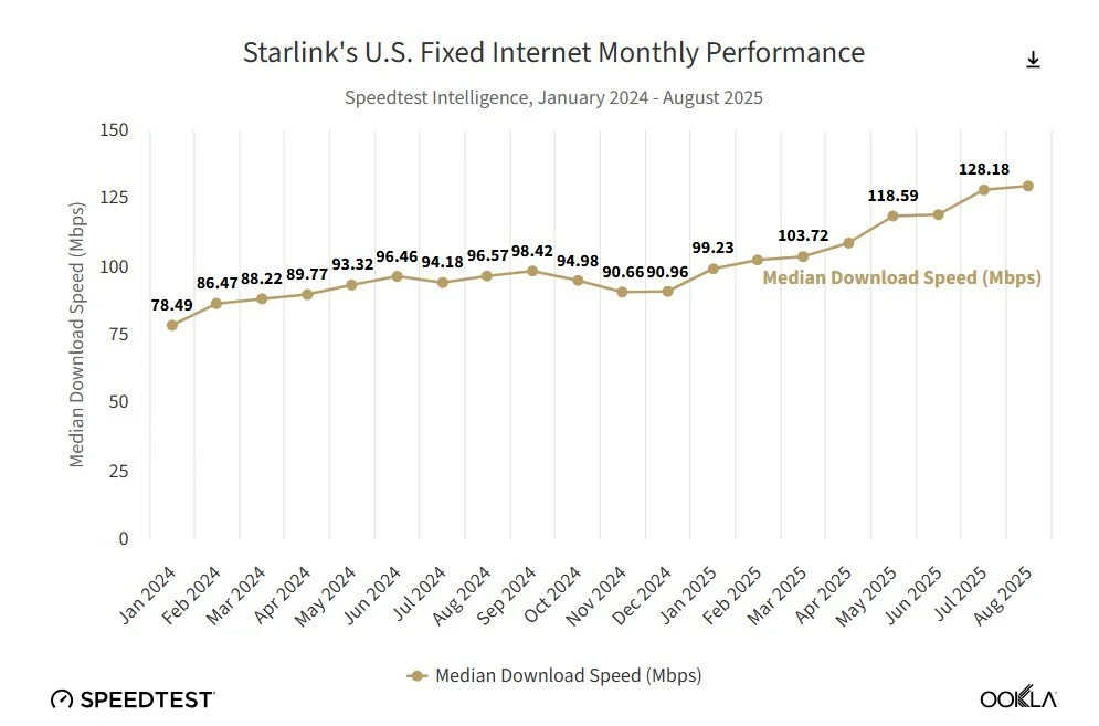 Despite the introduction of T-Satellite, Ookla reports that the download and upload speeds of Starlink’s fixed internet service have not decreased. In fact, median download speed has shown a gradual increase from 78.49 Mbps in early 2024 to 128.18 Mbps recently, with upload speeds also improving over time.