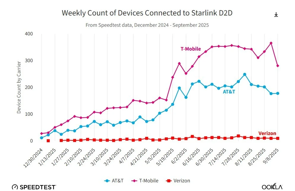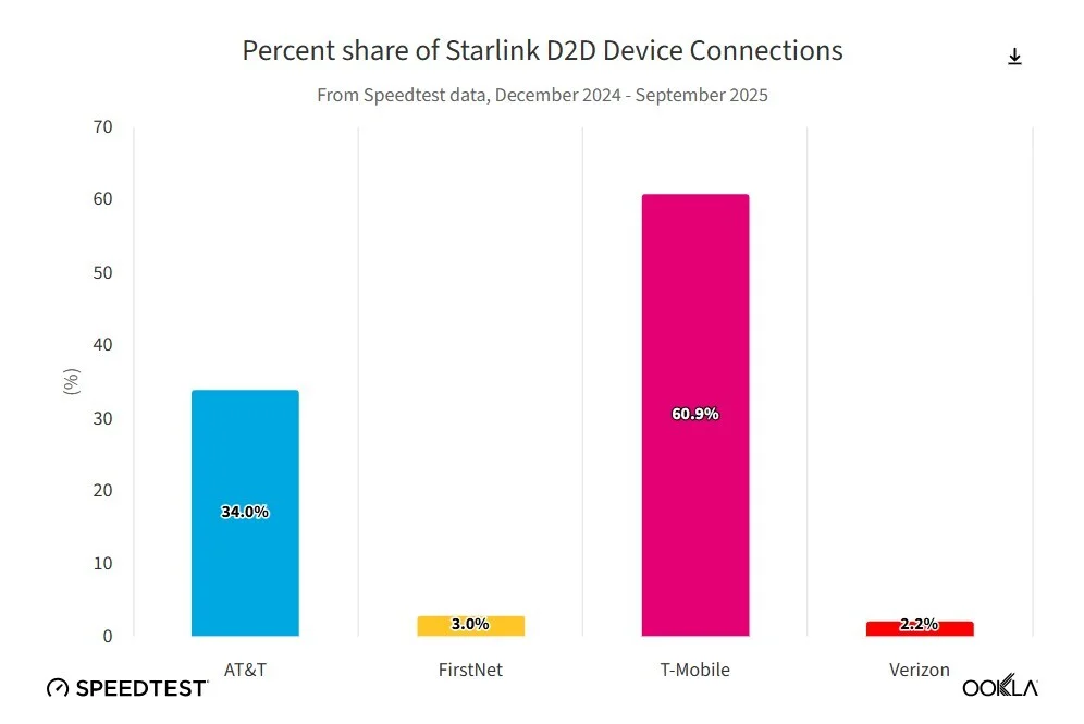 T-Satellite usage by T-Mobile customers surpasses that of Verizon and AT&T users. | Image credit: Ookla