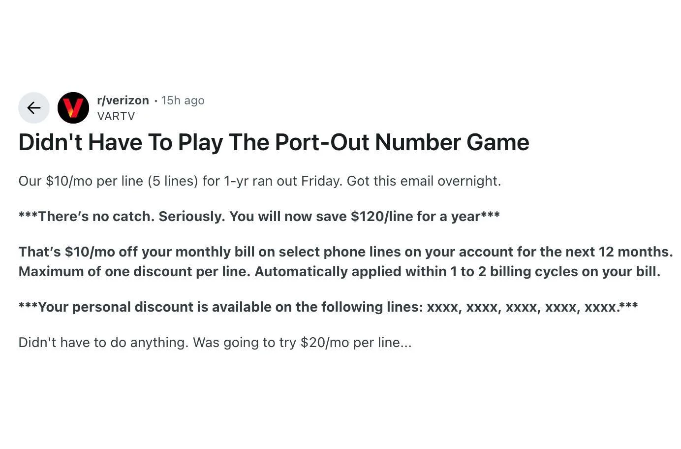 Customers have reported receiving discounts such as $10/month off on multiple lines for a year without any hassle.