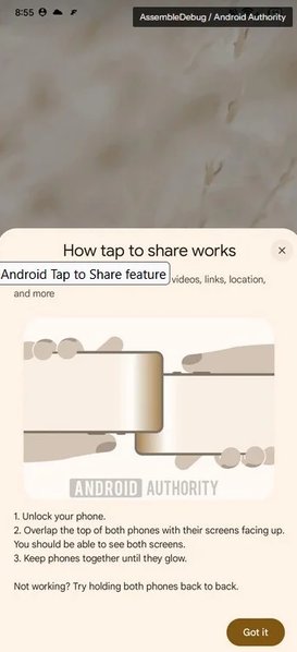 According to Android Authority, Google has activated the user interface for Tap to Share, revealing a card that outlines its capabilities. The card states, "Instantly share contact info, photos, videos, links, location, and more," indicating a wide range of sharing possibilities for Android users once the feature is launched.